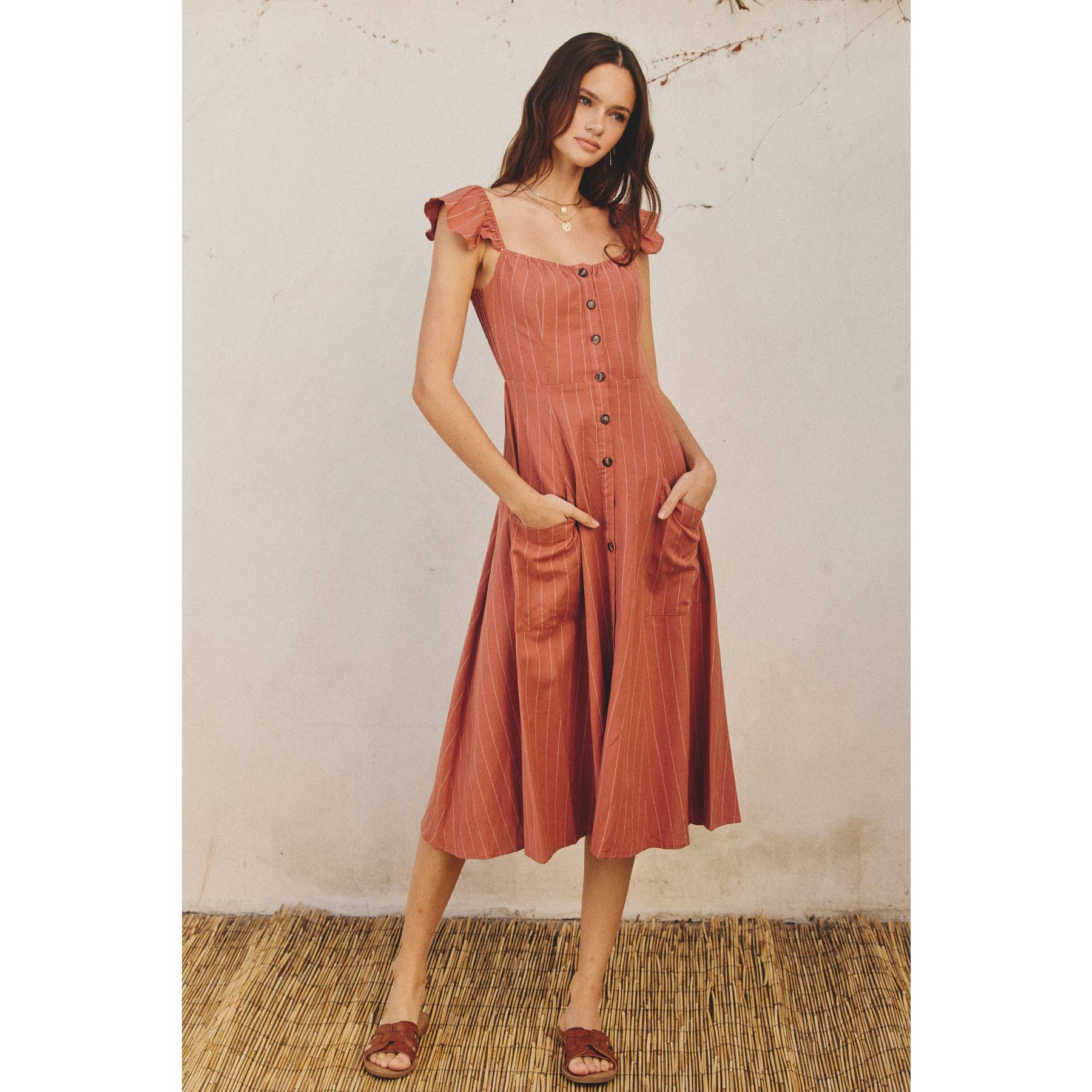 Pinstripe Flutter Sleeve Midi Dress: RUST/WHITE