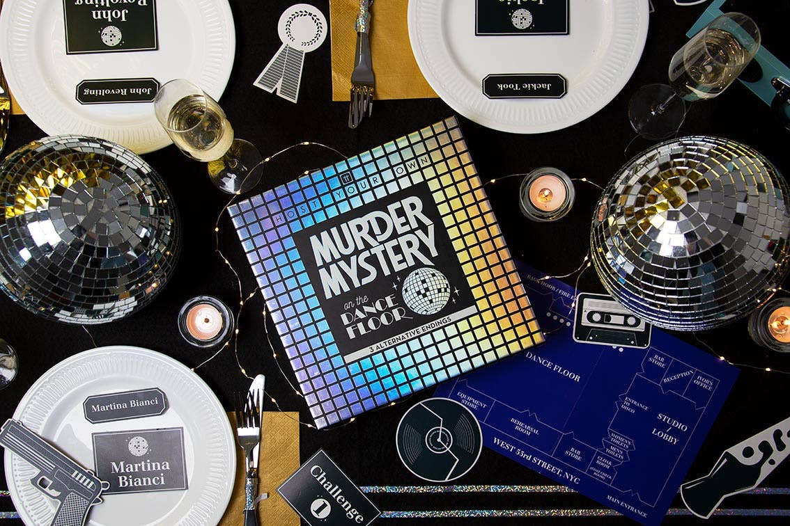 Murder Mystery on the Dancefloor Game by Talking Tables. Dangerous deeds have been taking place at Boogieland 77, the glitziest club in New York. Can your guests work out whodunnit? You’ll find all you need to throw a ‘killer’ 1970s murder mystery dinner party from the comfort of your home. This game is reusable with 3 alternative endings for multiple game nights!