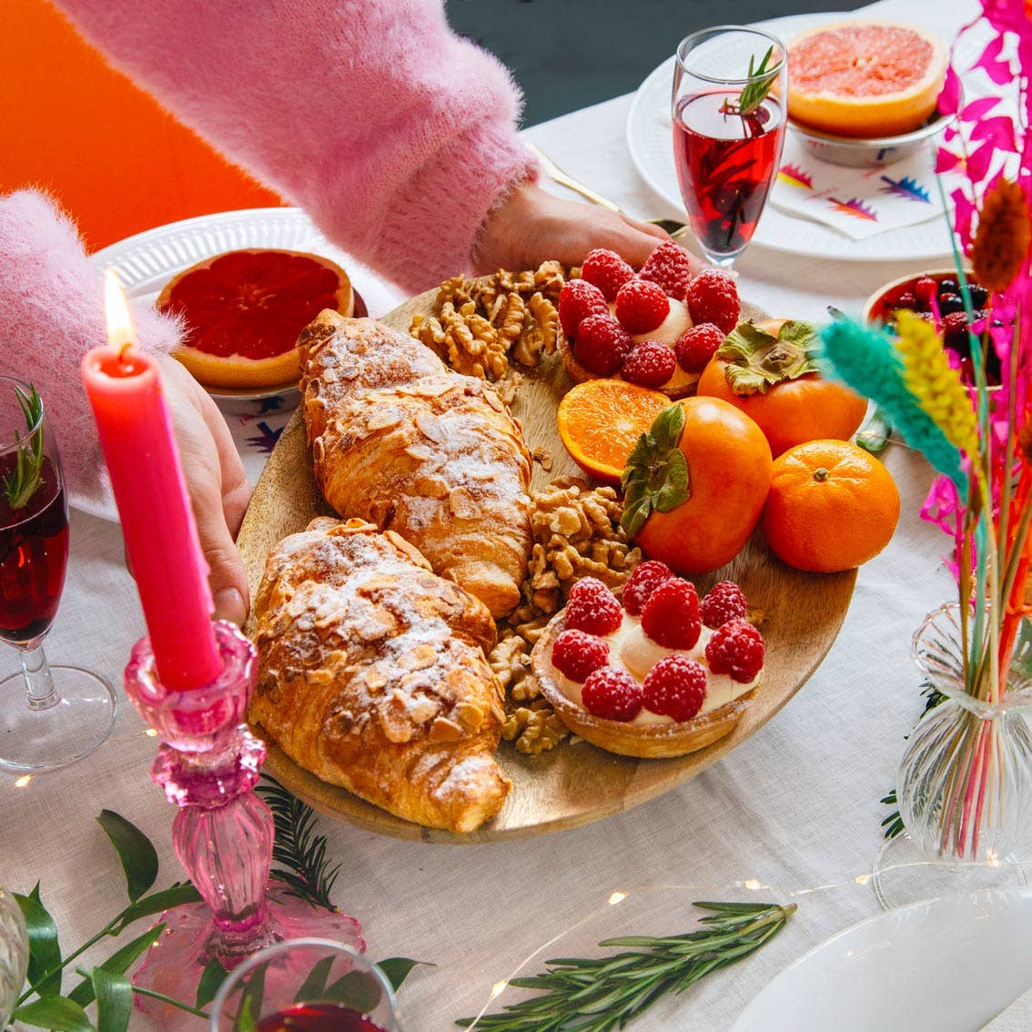 Our glass candlestick holders are also available in blue, green and red and can be paired with our matching colored dinner candles.