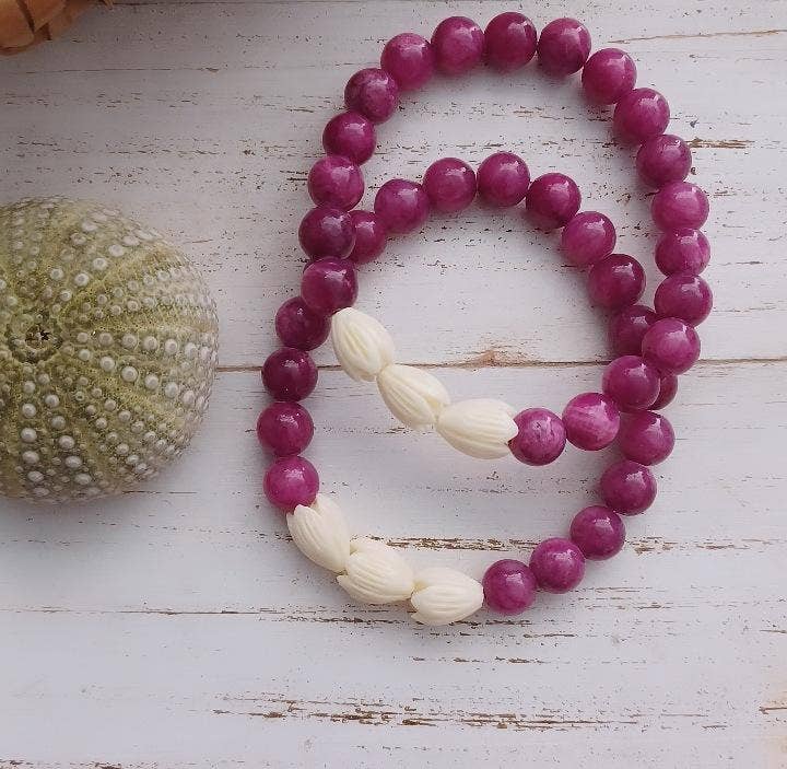 -Dyed Pink Jade 8mm round beads with Pikake Flowers in Cream color and fragrant Sandalwood 8mm