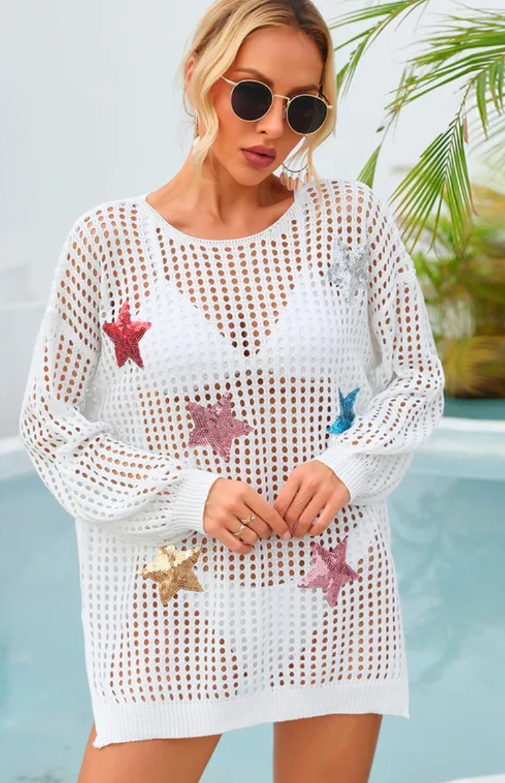 This white knitted bikini cover-up is a stylish and fun addition to your beachwear collection. Featuring multi-colored sequined star embellishments, it adds a touch of sparkle and whimsy, perfect for lounging by the pool or strolling along the shore. A chic way to shine under the sun!