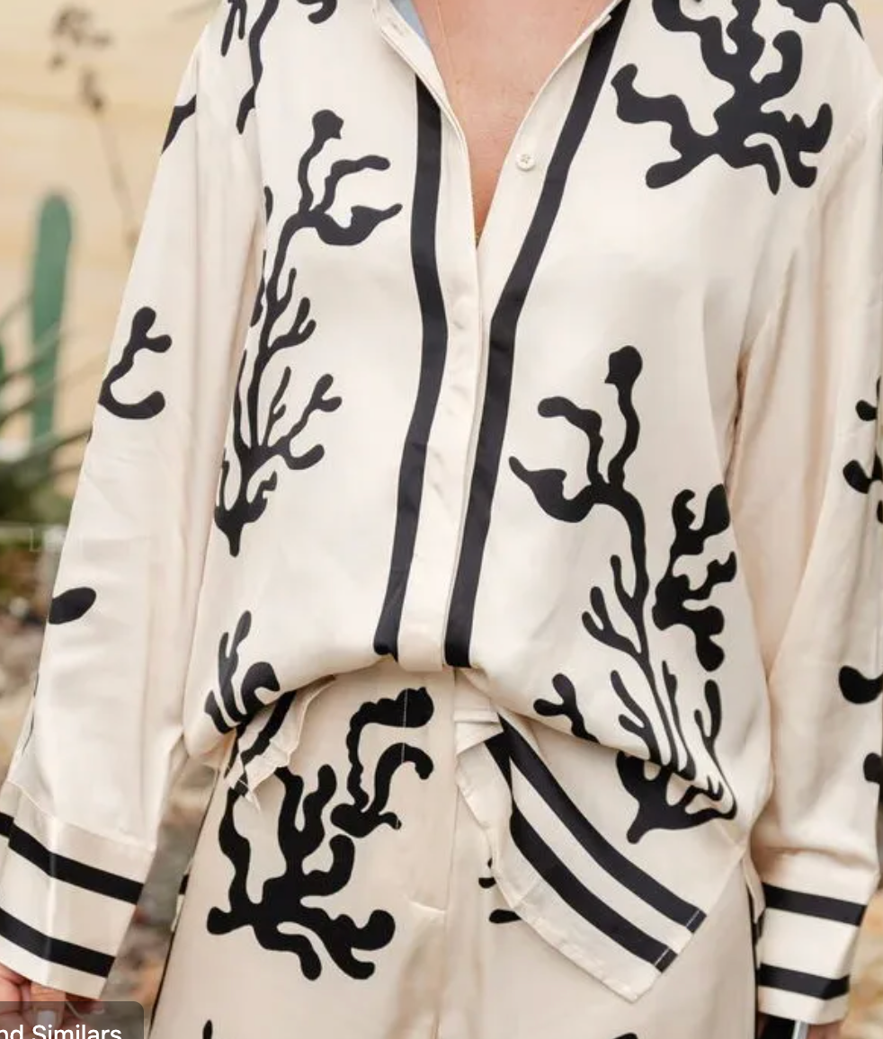 Add a touch of elegance to your wardrobe with this faux silk long sleeve button-up shirt. Featuring a chic black coral print on a crisp white fabric, this shirt offers a perfect blend of sophistication and style. Ideal for both casual and dressy occasions, it's a versatile piece that pairs beautifully with anything from jeans to skirts.