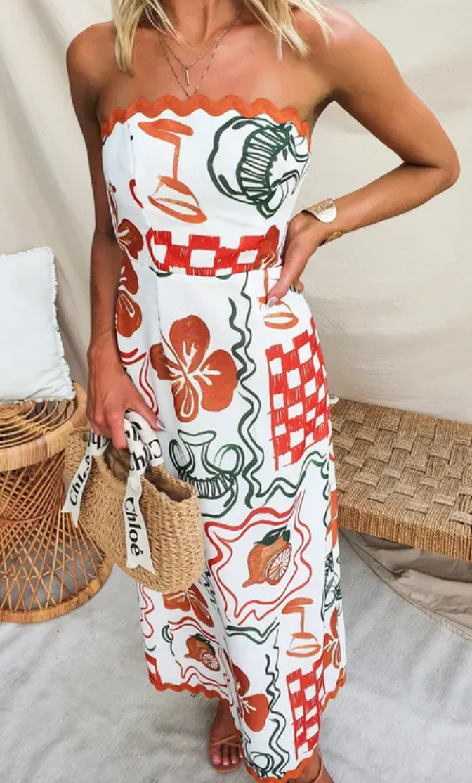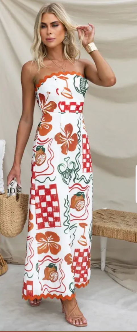 This strapless white dress brings tropical vibes to life with a fun Hawaiiana print featuring vibrant oranges and greens. Perfect for beach days or summer getaways, its playful design and flattering fit make it an easy choice for anyone looking to add a burst of sunshine to their wardrobe.