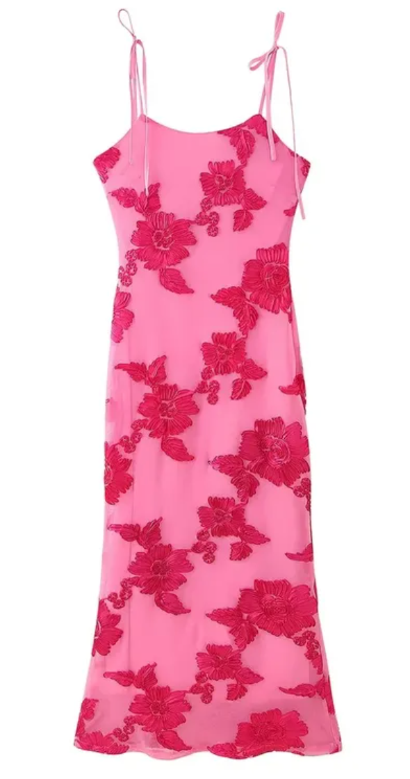This pink sling dress with a hot pink embroidered flower pattern is a vibrant, fun addition to your wardrobe! Featuring delicate spaghetti straps and a flattering fit, it’s the perfect choice for wedding guests or birthday celebrations. The eye-catching embroidery and bold colors make it a stylish and playful option for any special occasion.