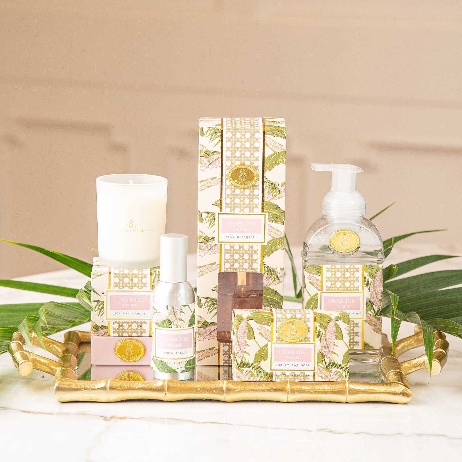 Introducing the enchanting Room Spray in our captivating Under the Palms fragrance, a delightful blend of herbaceous grapefruit, citrusy bergomot, green leaves, fresh mint, & warm amber. Enjoy these delicate notes that blend together to create a unique aroma that will enliven any room it's in! Crafted with meticulous attention to detail, this luxurious room spray lets you indulge in the aromas of a comforting environment while providing a soothing sense of exhilaration. This Room Spray is exquisitely packaged in a stunning & generously sized spray bottle featuring an intricate botanical & cane print, making it an elegant addition to your home decor or the perfect gift. Each spritz will refresh any room in the house with wonderful notes that bring a lightness to all areas of your daily life!